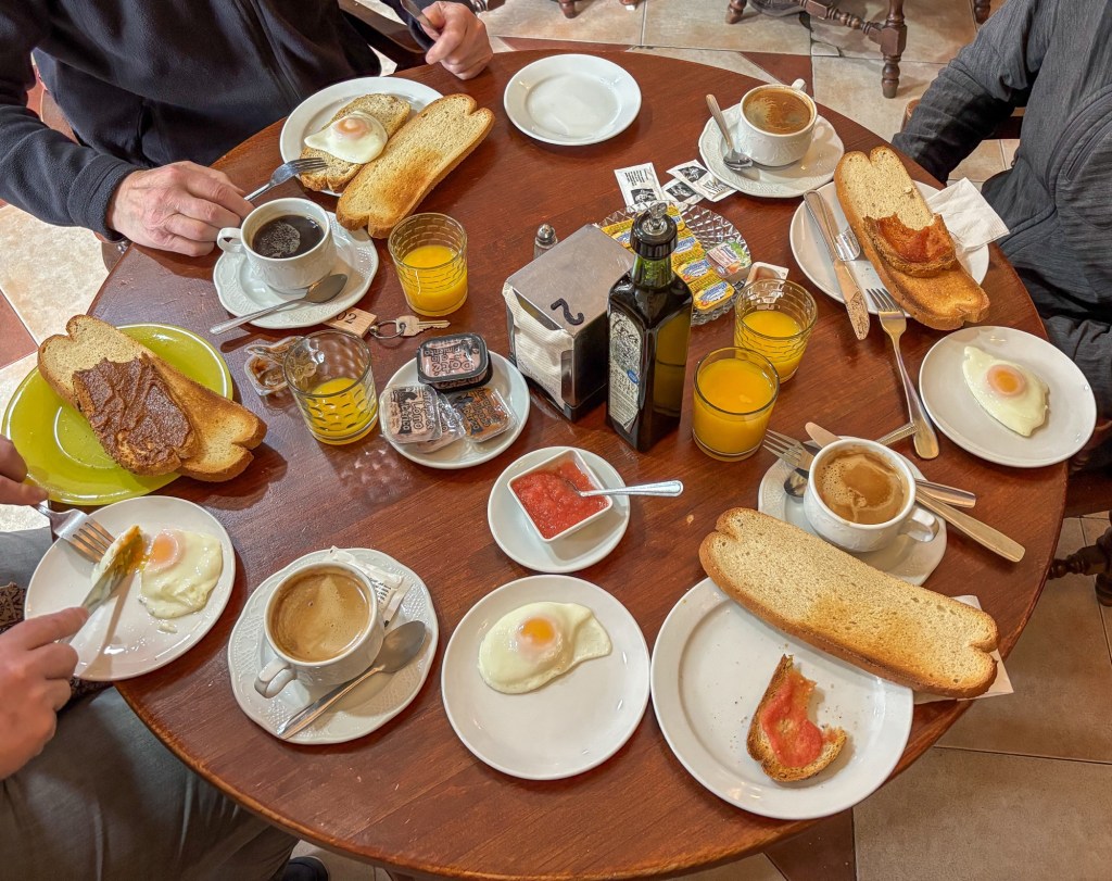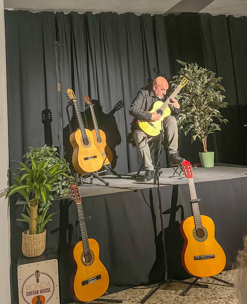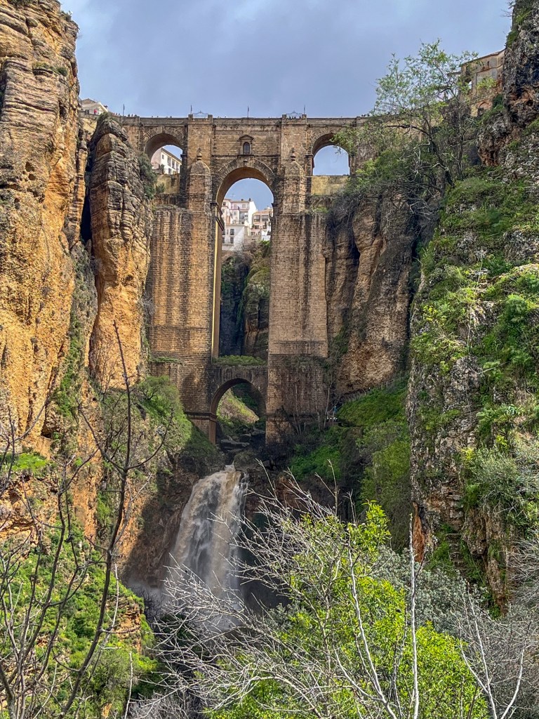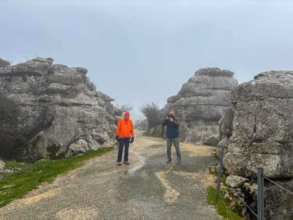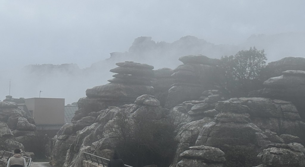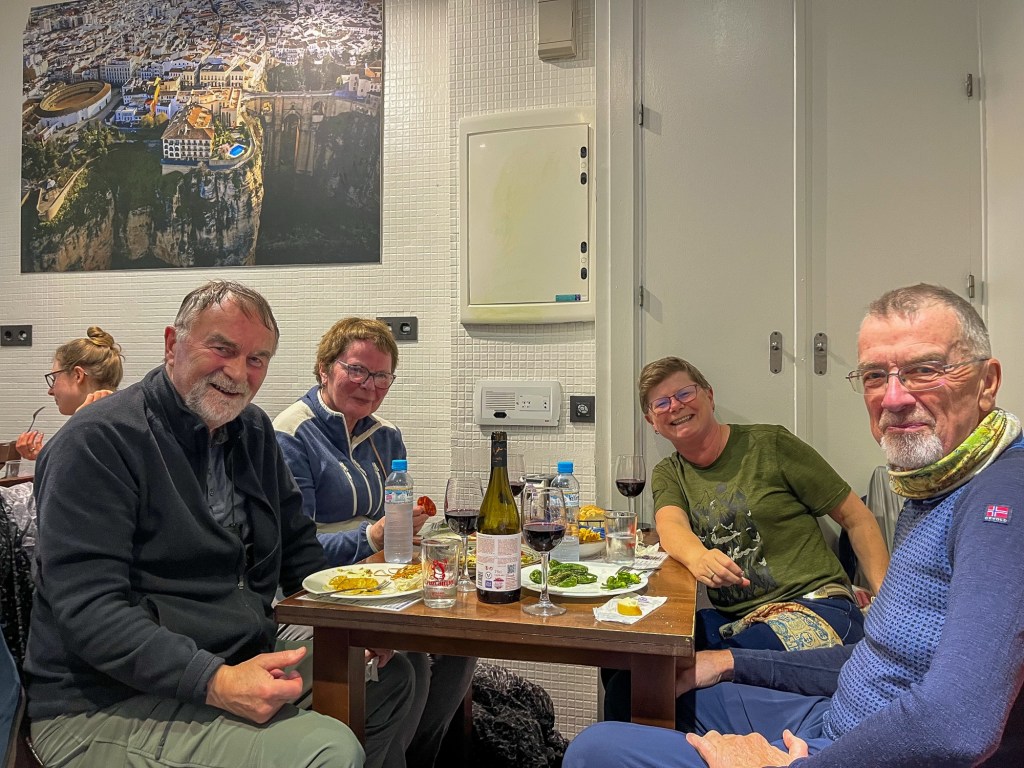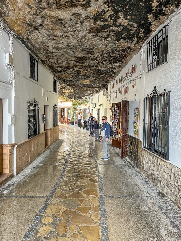 Tåkete og regn på El Torcal.Pannekake-fjell.Vin og tapas innendørs i Ronda.Fenomenal frokost, og i tillegg kom det pannekaker.Utsikt fra broen i RondaDen samme broen sett fra dalenEllers er Ronda en Andalusisk hvit by.Spansk klassisk gitar, flamenco gitar samt en beregnet for romantisk musikk. En herlig konsert.En annen av de hvite byer man må besøke er Setenil de la Bodegas. Mange hus er bygd i og under fjelletLitt rart med bygninger både over og under berget.På by-vandring