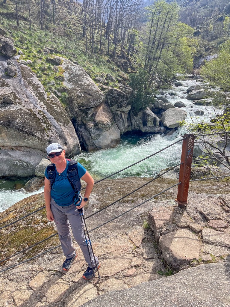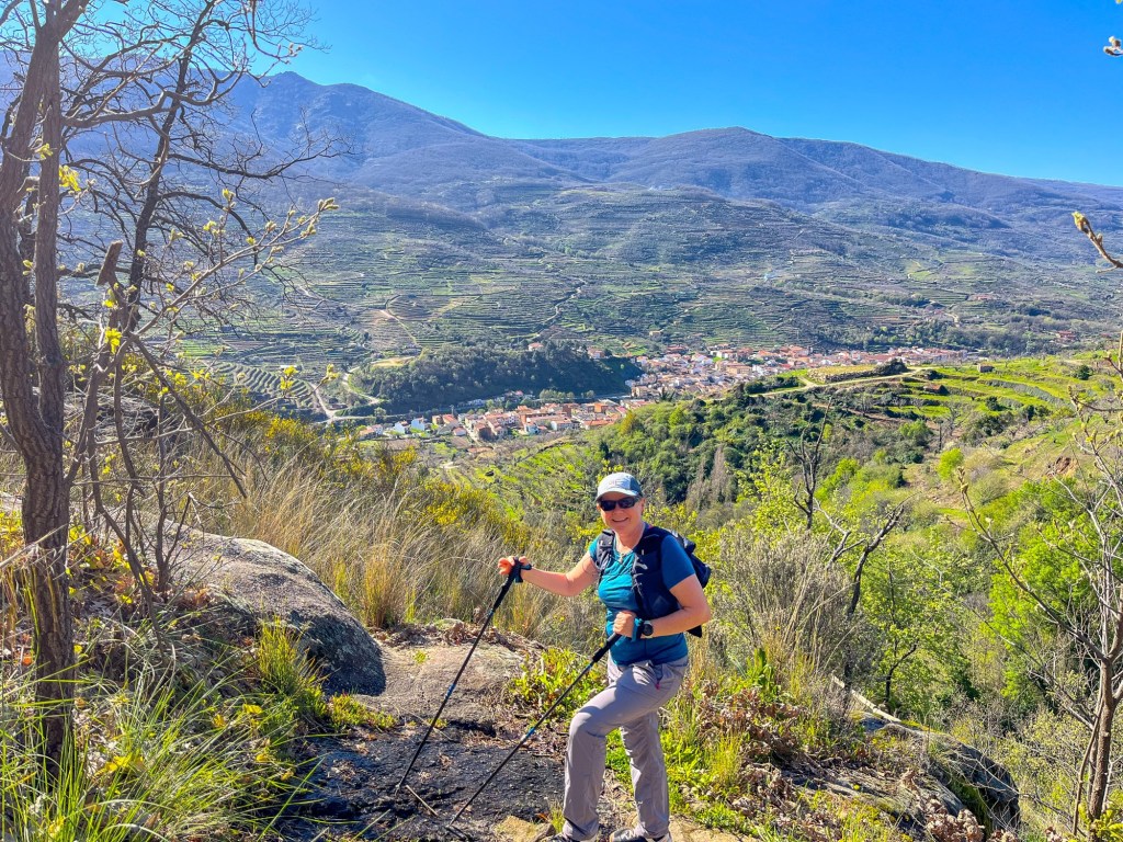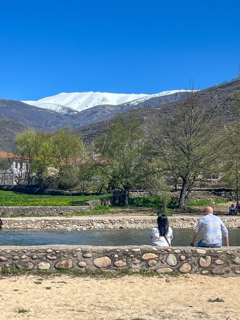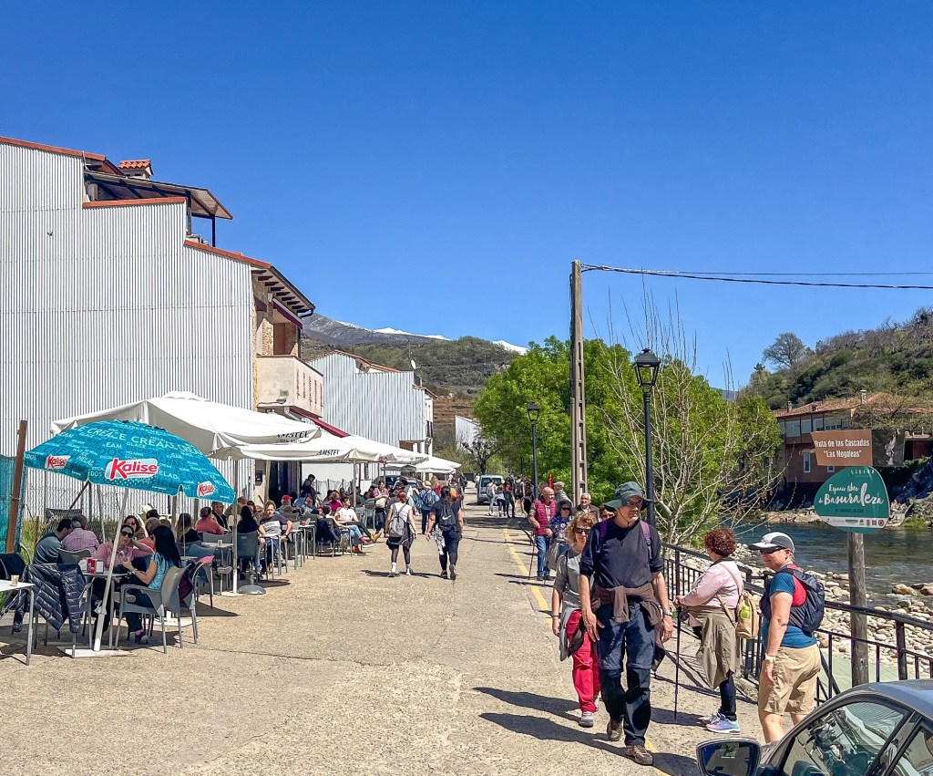 Ingen tåke og regn denne gangen.Vi gikk den lengste rundturen på ca 3 km..Noen trange pasasjérOg for en avslutning. Like ved besøkssenteret så vi 20 stykker av de lokale fjell geitene.Og så kom sjefene med to store horna.På veien nordover overnattet vi en av «pilgrimsbyene». Alcujen ønsker å vise seg frem for vandrerne.Navaconcejo i Valle de Jerte ønsket velkommen ved en nydelig klippet hekk.Kommune administrasjonen hadde malt dansebilder av noen av sine eldre på veggen. KultDet er vår med snø i fjella, fulle vannmagasin og fosser.Det var en skikkelig greie med stier og rekkverkOg vannføringen var imponerende.Ingen skal falle i fossen her.På lørdag var både stiene og restaurantene fulle av lunsjgjester. Mange dagsbesøkene fra andre siden av fjellet.Det har vært en kald og fuktig vinter i flere deler av Spania. Kisebærblomstringen var så vidt begynt.Men vi hadde flere fine gåturer i dalen. Skikkelig våruke med ove4 20 varmegrader på dagen.Vi flyttet oss noen kilometer lenger inn i dalen. Her var det lov å campe på en slette ved elven. Bare å nyte.En fjelltur opp i 1500 meter over havet. Skikkelig påskestemning med snø på høyfjellet.En herlig dal å besøke selv om ikke blomstringen hadde startet for fullt.Årets første lavendel.Vårsamling for å vise frem hestene sine.Overhengende balkonger pyntet en av mange religiøse høytider.Flere fossefall.Det er ikke alle som «går» tur.Det ble sprøytet noen på og mellom trærne. Denne karen gjorde at vi ble litt usikker på hva de sprøytet.Det begynner å hvites.
