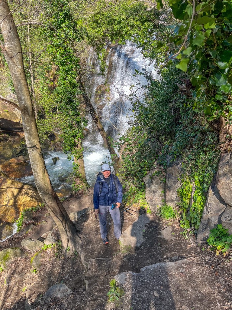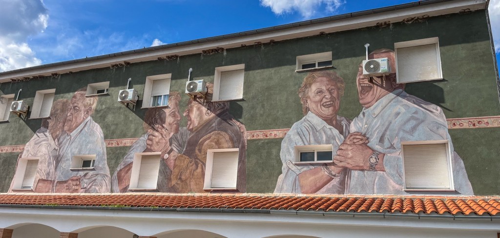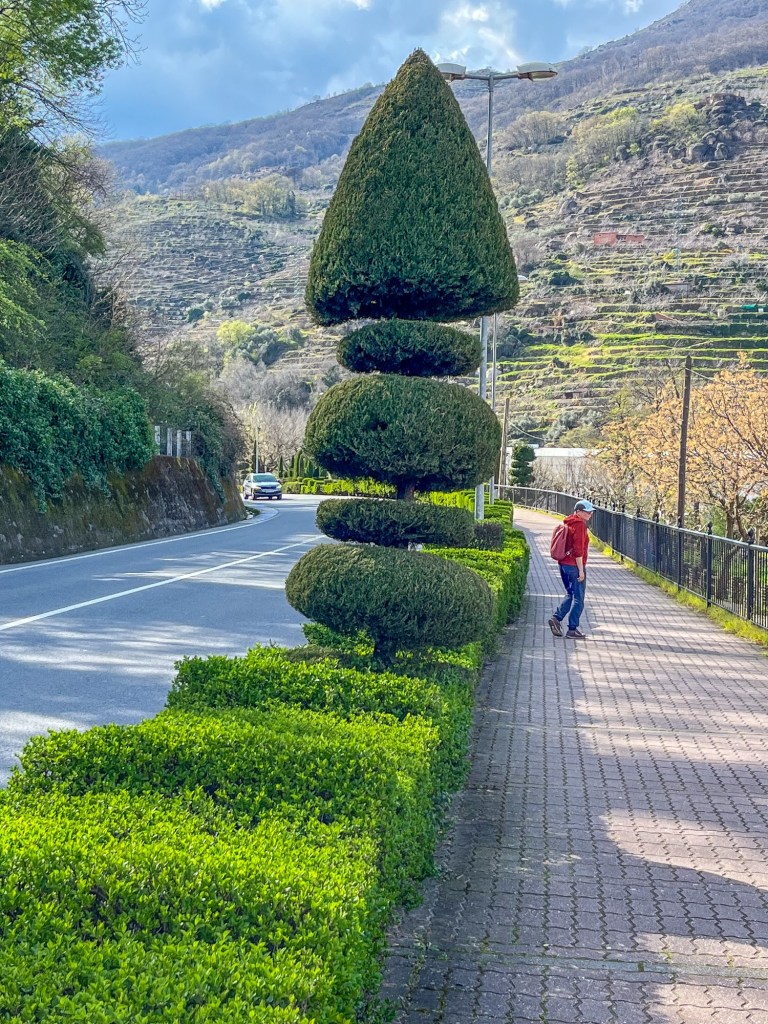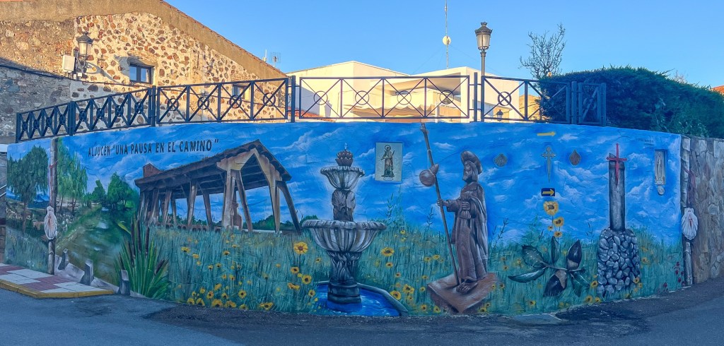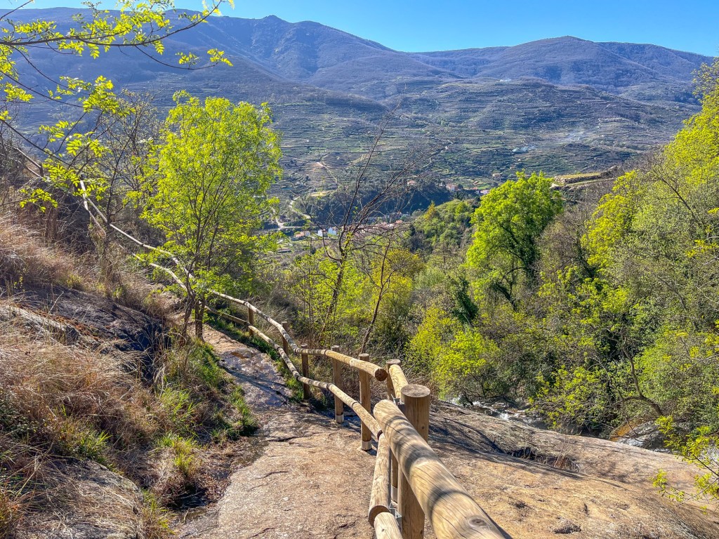 Ingen tåke og regn denne gangen.Vi gikk den lengste rundturen på ca 3 km..Noen trange pasasjérOg for en avslutning. Like ved besøkssenteret så vi 20 stykker av de lokale fjell geitene.Og så kom sjefene med to store horna.På veien nordover overnattet vi en av «pilgrimsbyene». Alcujen ønsker å vise seg frem for vandrerne.Navaconcejo i Valle de Jerte ønsket velkommen ved en nydelig klippet hekk.Kommune administrasjonen hadde malt dansebilder av noen av sine eldre på veggen. KultDet er vår med snø i fjella, fulle vannmagasin og fosser.Det var en skikkelig greie med stier og rekkverkOg vannføringen var imponerende.Ingen skal falle i fossen her.På lørdag var både stiene og restaurantene fulle av lunsjgjester. Mange dagsbesøkene fra andre siden av fjellet.Det har vært en kald og fuktig vinter i flere deler av Spania. Kisebærblomstringen var så vidt begynt.Men vi hadde flere fine gåturer i dalen. Skikkelig våruke med ove4 20 varmegrader på dagen.Vi flyttet oss noen kilometer lenger inn i dalen. Her var det lov å campe på en slette ved elven. Bare å nyte.En fjelltur opp i 1500 meter over havet. Skikkelig påskestemning med snø på høyfjellet.En herlig dal å besøke selv om ikke blomstringen hadde startet for fullt.Årets første lavendel.Vårsamling for å vise frem hestene sine.Overhengende balkonger pyntet en av mange religiøse høytider.Flere fossefall.Det er ikke alle som «går» tur.Det ble sprøytet noen på og mellom trærne. Denne karen gjorde at vi ble litt usikker på hva de sprøytet.Det begynner å hvites.