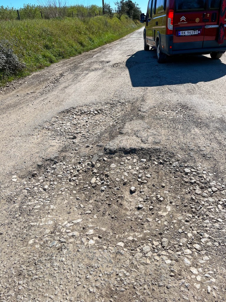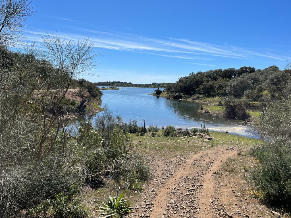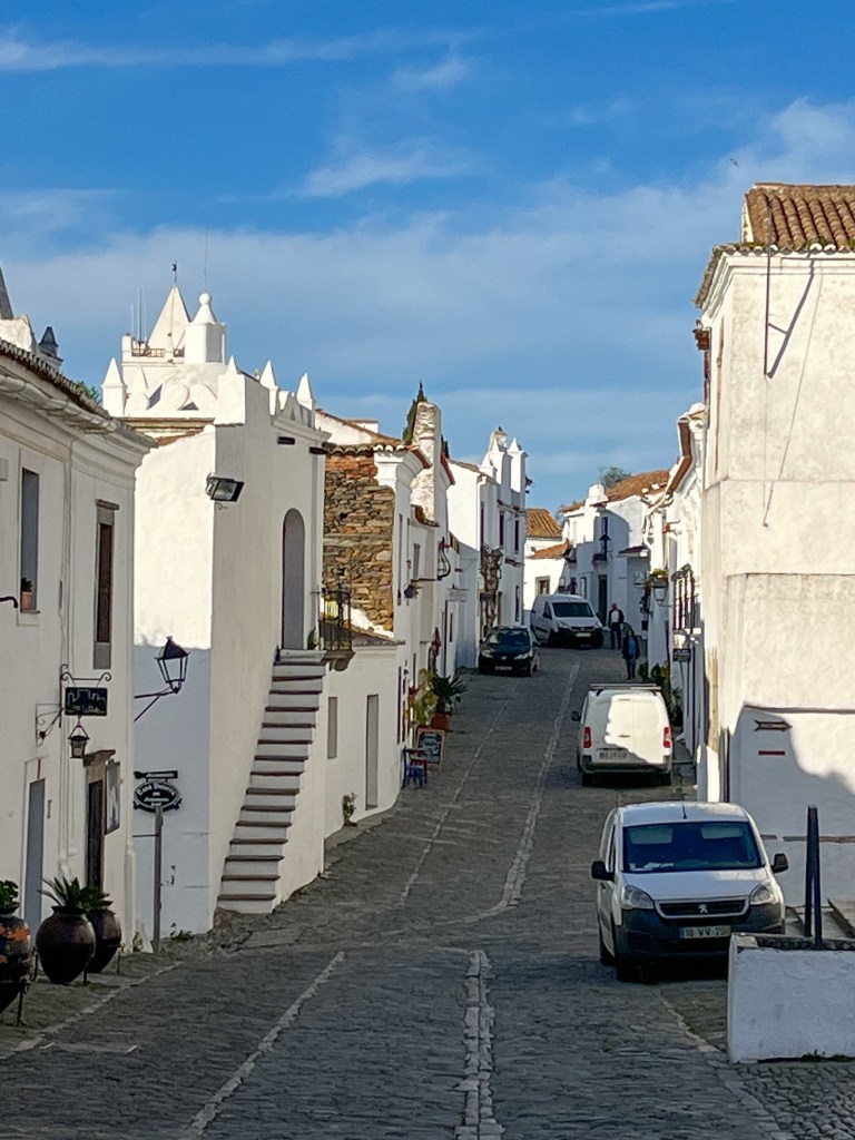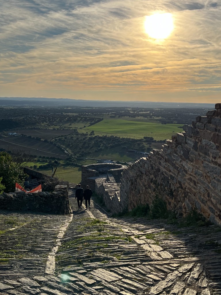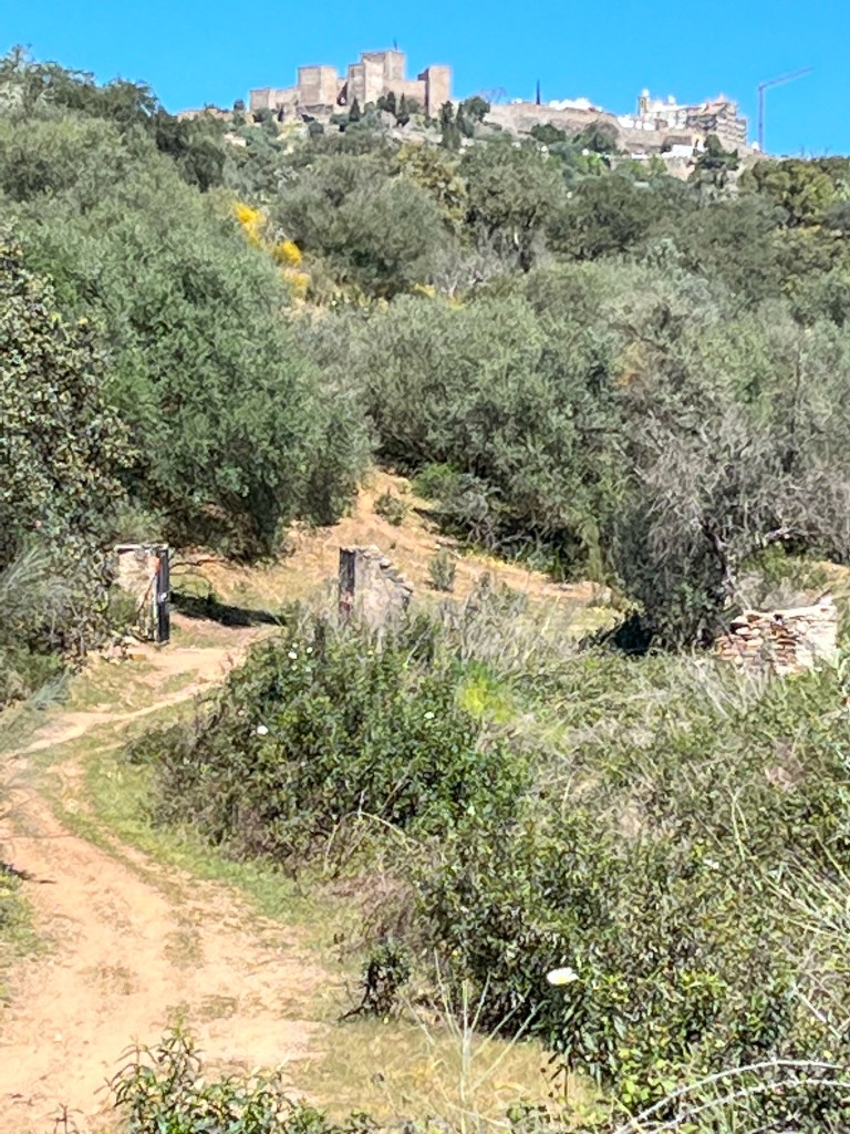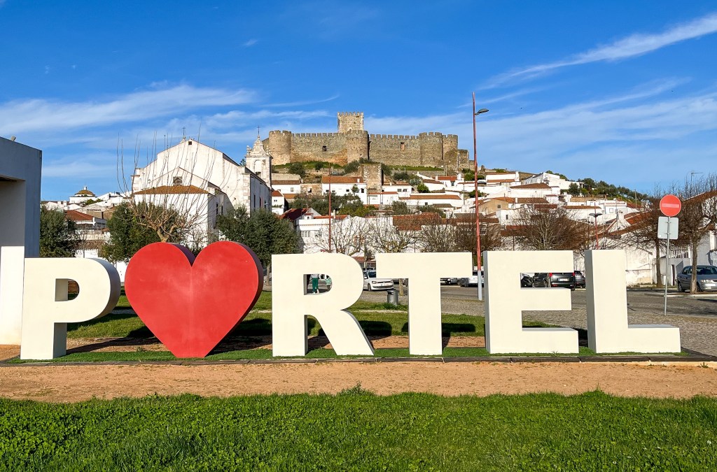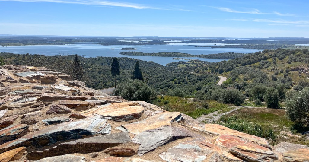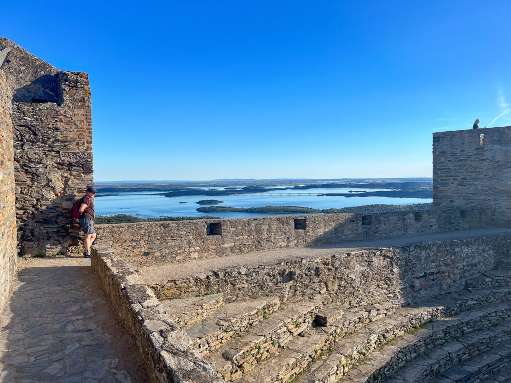 Portel med sin borg på toppen. Det morsomme med denne byen var at den gratis bobilparkeringen var omkranset av alle nødetater; brannvesen, ambulanser, lokal politi, nasjonalt politi (gerndarmen) og justisbygget med alle nivå av domstoler. Vi sov trygt.Noen ganger leder madam Google oss ut på ville veier. Denne veien var nok minst antall kilometer, men men, 10 – 20 km i timenMålet for dagen var Monsaraz. En festningsby på en klippe midt i det åpne landskapetDen ligger ved europas største kunstige innsjø; Alqueva Dam. Igjen er det grense-elva Guadiana som er grunnlaget for denne innsjøen.De første spor etter borg her stammer fra førhistorisk tid. Denne klippen midt i et åpent landskap ville alle kontrollere; romerne, maurerne og spanjoler for å nevne noen. Tempelridderne hjalp spanjolene med å kaste ut maurerne. Nåværende borg er fra 1400-tallet.En hovedgata langs toppen av klippen. Ikke plass til bobiler her. Dette en nasjonalskatt i PortugalPå 1800-tallet bygde lokalbefolkningen en tyrefektingsarena inne i borgen. Den ligger spektakulert til.På andre siden av klippen er det jordsbruksland. Ettermiddagstimen er heller ikke å forakteFine turmuligheter i området.
