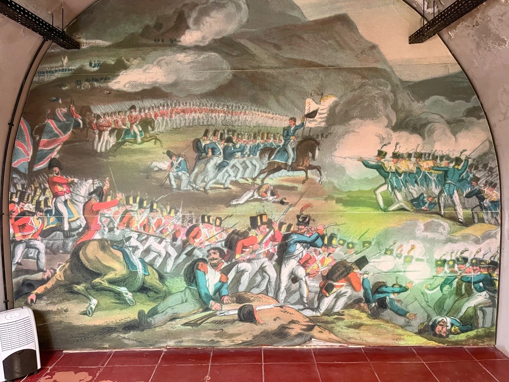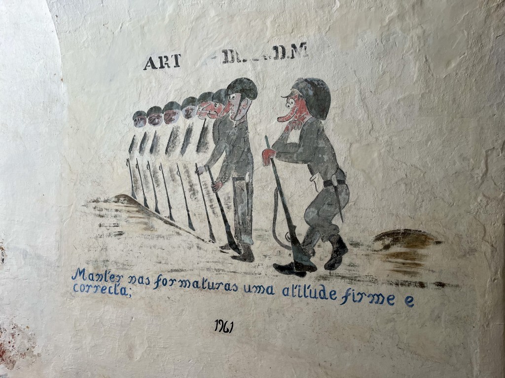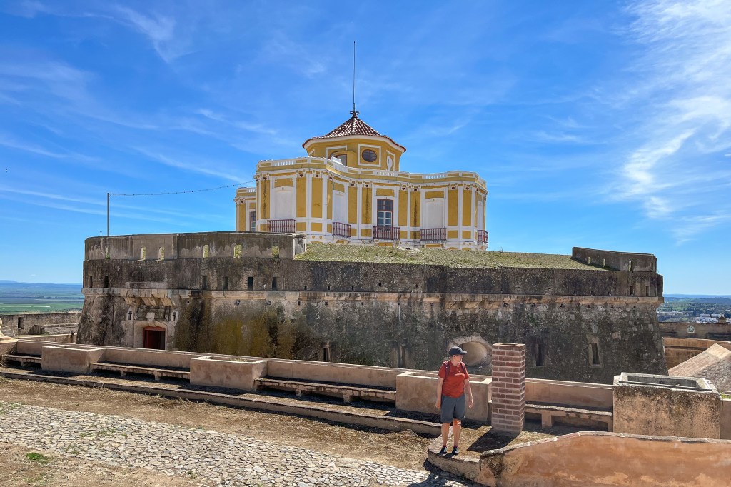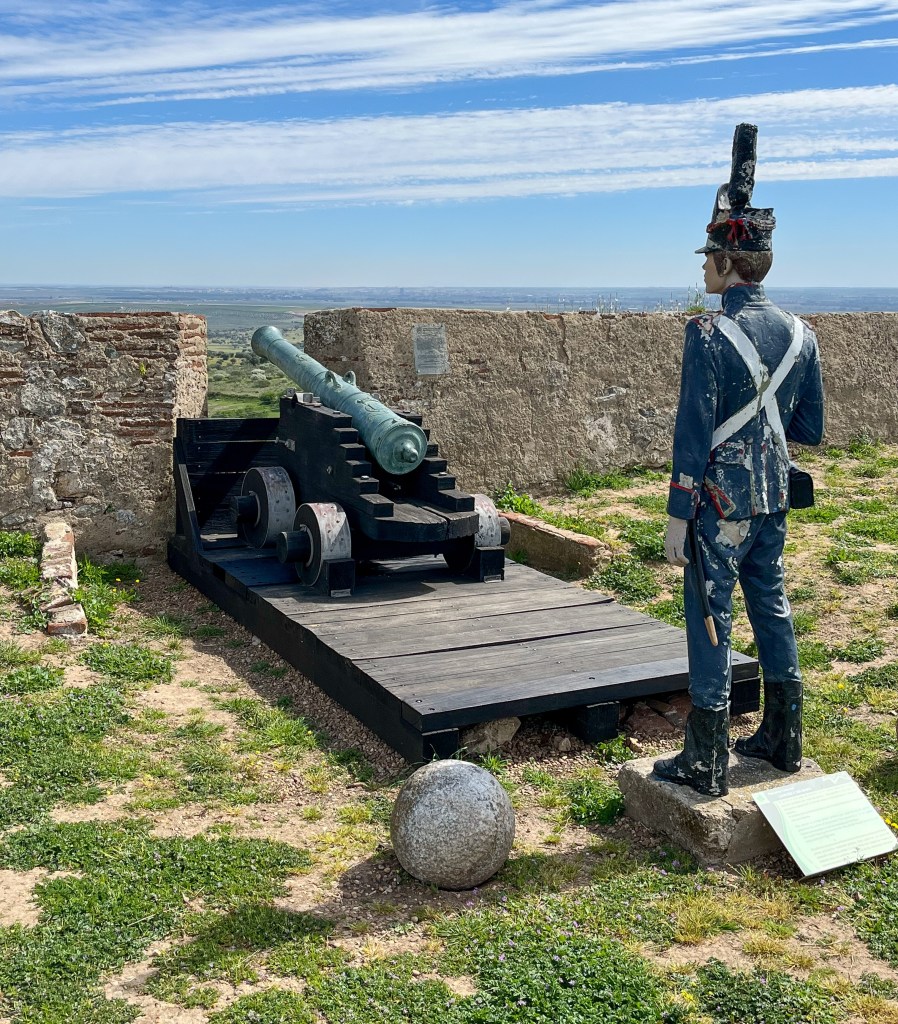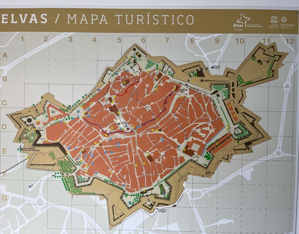 Et turistkart gir nok den beste oversikten over byenAkvadukten er imponerende. Her fikk vi parkere og sove gratis.Det var flere voldgraver som måtte passeres.Vi brukte de offisielle inngangene.ikke alle var beregnet for dagens kommunikasjonsmidler.Nyt utsiktenDette anlegget er neste borg på neste høyde i landskapet. Tre forskjellige stjerneformede borger oppå hverandre.De hadde full kontroll over eventuelle angripere her.Litt offisiell tagging fra 1960 tallet.På toppen av anlegget lå guvernørens palassSjefen måtte ha det fint, selv i krigstider.Utsmykningen her var imponerende.I og med at dette bygget var tredje etasjen av borgen, hadde selve palasset noen underetasjer.Fyrstikk-versjonen.Med fri sikt til Badajoz i SpaniaFra museet inne i en av borgeneDe hadde underjordiske ganger mellom festningene og byen.Elvas – vel verd et besøk