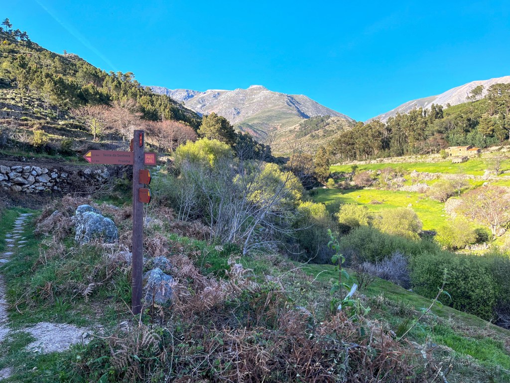 Utsikt over byen fra et gammelt vindu i festningen. Et del av labyrinten i hagen til biskopene på 1600 tallet.Her er det statuer av apostler, biskoper, konger, verdensdeler, måneder og årstider.Det er et imponerende byggverk.Et flisemaleri av Castelo Branco på den tiden.Gate i gammelbyen, med festningen på toppenHusene er bebodd. Noen er oppusset, andre mere nedslitt.Full vårblomstring.Mange av byene i Portugal er prydet med veggmalerierFarvel til Castelo Branco med fontenen i kvelds-stemning.Vi nærmet oss nasjonalparken Serra da Estrela. Her har vi parkert i en av dalene opp mot parken. Nydelig sted.De hadde gjort sin erfaring med å legge en liten bekk i rør. Naturen vil styre seg selvDet er mange merkete stier inn i parken. Både korte som de kaller PR, og de lange GR.Det der hadde vært et stor tre.Tid for vask av klær.