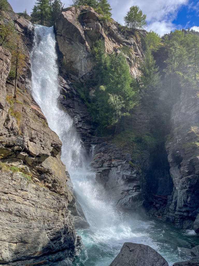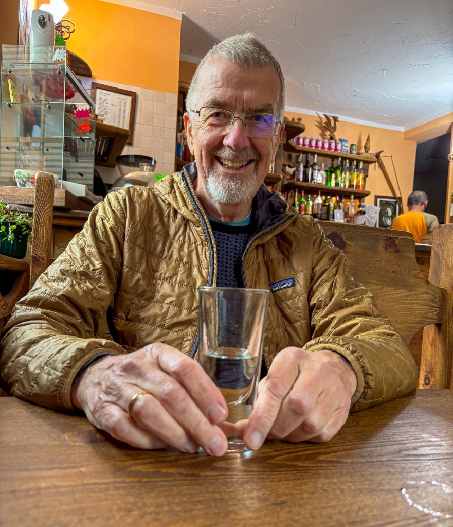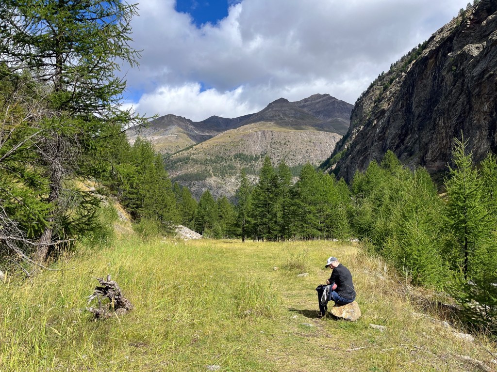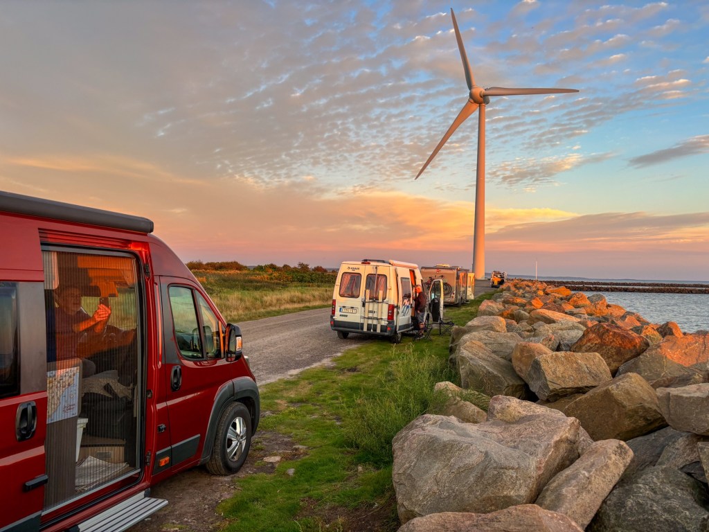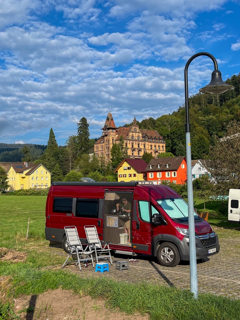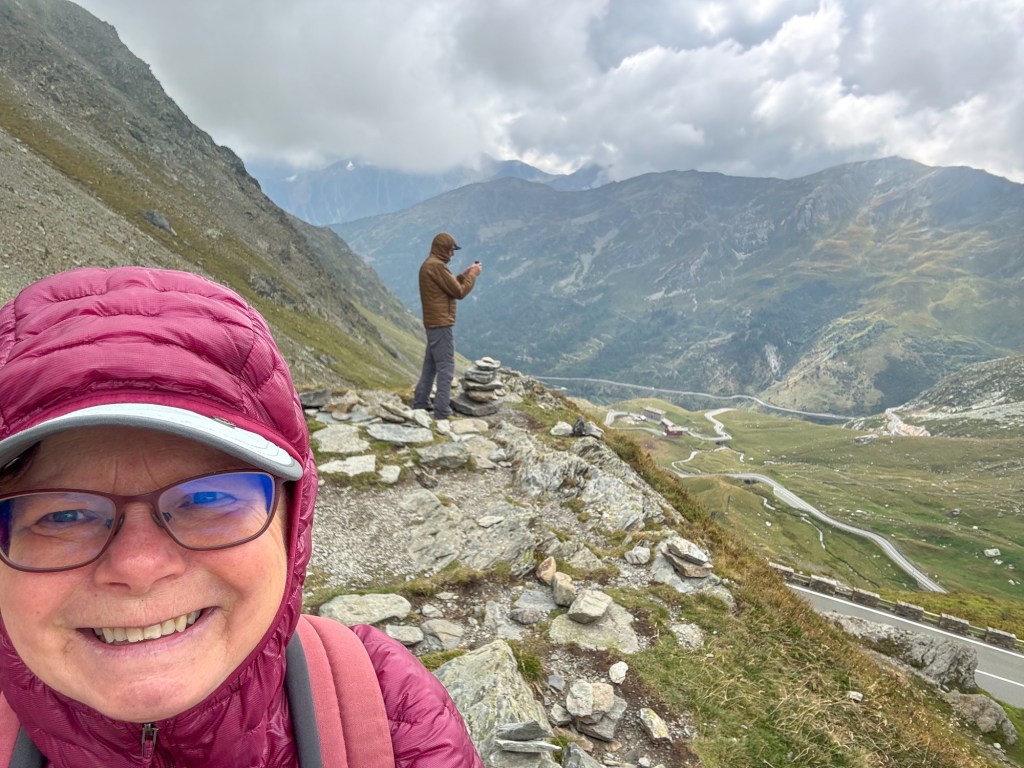 På høsten kan parkeringsplassen til en badestrand være en fredfull overnatting. Så også i Karlstad.Litt spesielt, men vi drikker mye kaffe fra Löfbergs. I Karlstad gikk vi plutselig forbi deres brenneri og hovedkontor i Karlstad, og bare måtte vi ta dette bildet.Neste stopp – vindmølleparken ved Falkenberg. Lite vind denne kvelden, så det var ikke mye lyd fra dem.Vi kunne nyte en nydelig aften på sveriges vestkyst.Seks timers fergetur med Stena Line fra Trelleborg til Rostock i Tyskland. Vi hadde selskap av mange andre bobiler på vei sørover.«The white cliffs of Dover»?. Nei. Dette er fra øya Møn i Danmark.Etter en par dagers kjøring er vi i Schwarzwald. Denne landsbyen heter Nordrach. Her er lufta så forfriskende at de har kuranstalter for lungepasienter. Gratis parkering og ingen turistskatt, men kuravgift; Euro 1,70 per person pr døgn. Vi testet lungekapasiteten med en god dagstur.Litt spesiell farge på disse sneglene.Motlys på dagens høyeste punkt.Landsbyen var vakkert dekorert med blomsteroppsatser. Vet ikke om denne tipien var i henhold til norske byggeforskrifter.Sveits. Vi hadde planlagt noen dager utenfor Basel. Det ble til en ettermiddag med en nydelig middag hos Ueli og Myrta. Sveins hoste og heftige forkjølelse gjorde at vi gjemte oss litt bort på en parkering på landsbygda. Værvarselet lovte bedre vær i Italia enn i Sveits. Vi krysset grensen gjennom Gran St. Bernard passet.St. Bernard hunden er oppkalt passet.Alltid blid, selv om det ble mye kjøring når den andre bare hoster og harker. Klosteret på toppen har gitt husly til reisende fra 1100 tallet.Italia, her kommer vi. Forhåpentlig litt varmere nede i Aosta-dalen.Nasjonalparken Gran Paradiso ligger sør-øst for Aosta-dalen. Vi kjørte øverst i Cogne-dalen. I landsbyen Lillaz ble vi i 3 netter. Vi hadde to fine turdager.Nok av turer å velge i.Først litt ilaliensk hostemedisin, Grappa.Mye vann her. Ifølge han som serverte meg grappa er det ca 100 fosser som man driver med isklatring i om vinteren.Treskjæring på veggen som klart indikerer den store vinteraktiviteten her. Innerst inne i dalen er det ingen taubaner eller slalomløyperSommerpyntDalbunnen var vasket vekk av denne lille elva. Store skade i området etter styrtregn.Det er herlig turområder her. Vi behøver ikke dra opp til toppene. Stiene i fjellsidene og dalene fungerer veldig godt. Godt merket.