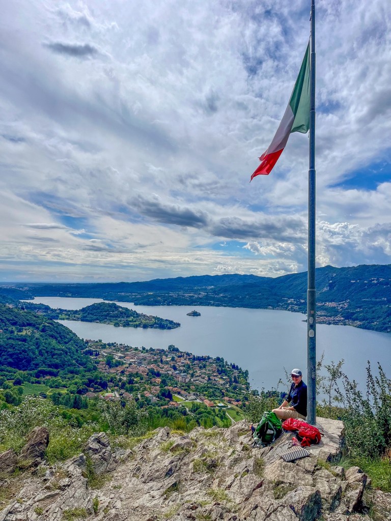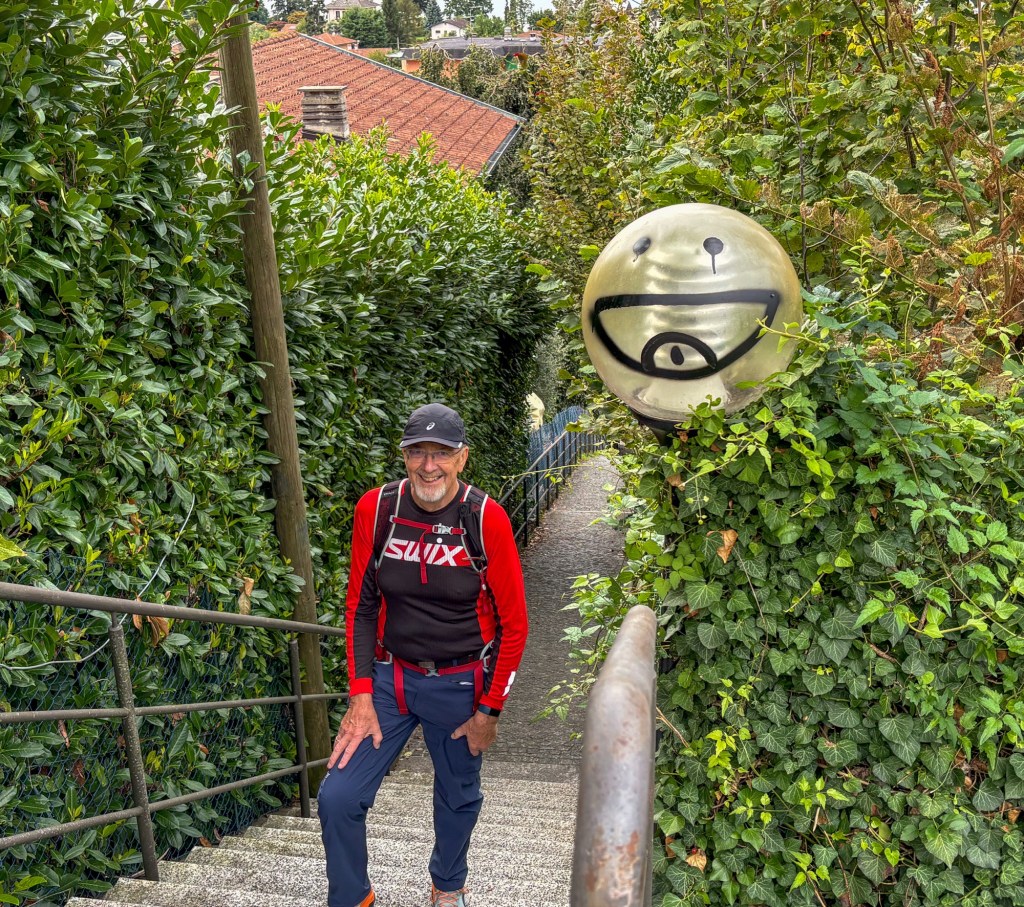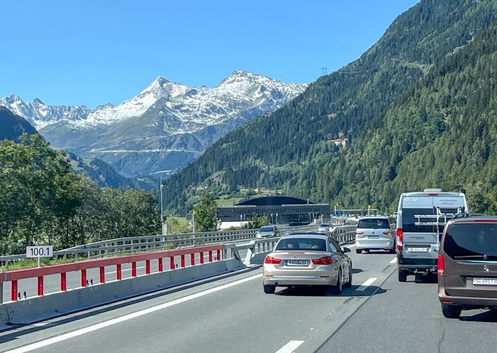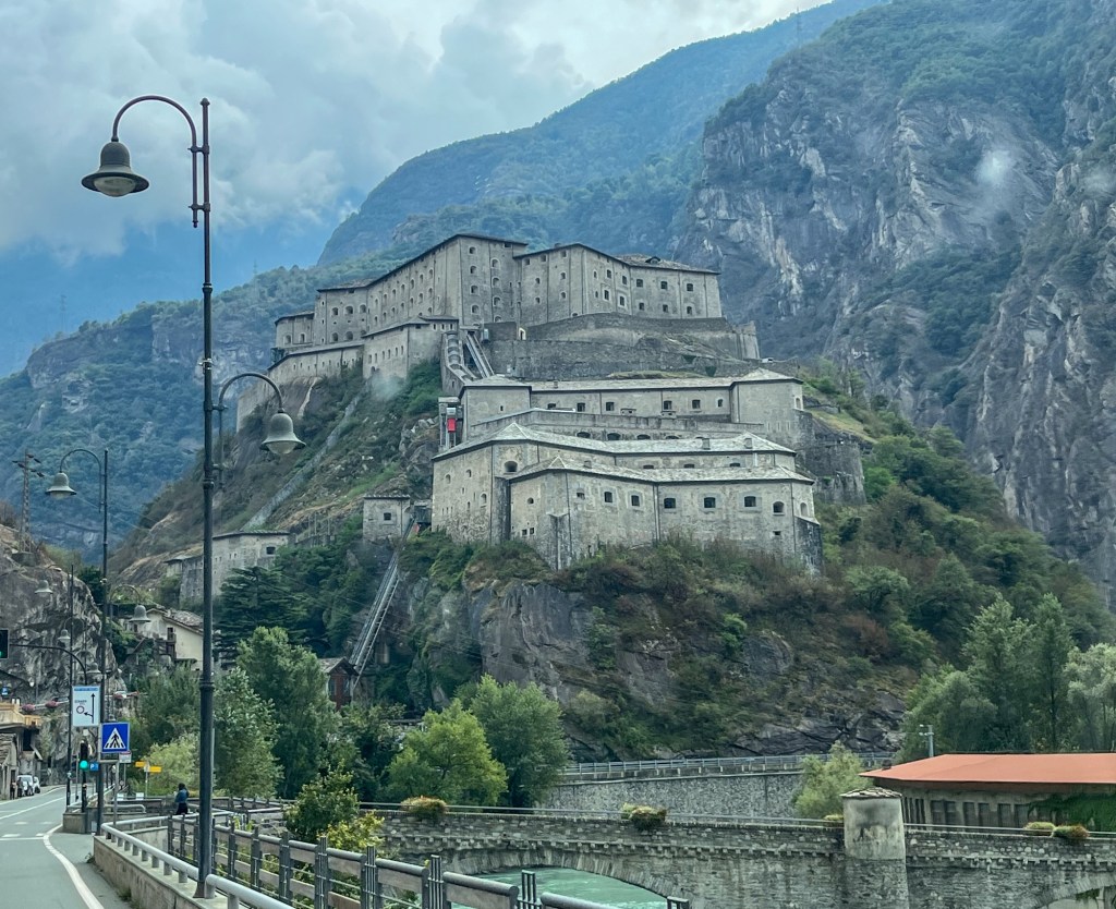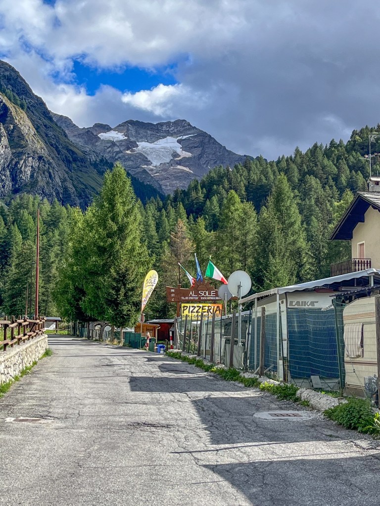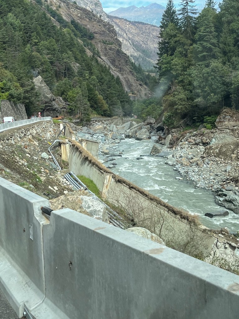 Litt pizza før «hjemturen».Og der har Mont Blanc fått vinterens kappe på seg.Utenom allfarvei. En camping og pizzeria ved veiens slutt.Idyllen kan brått ta slutt. Oppover var det så mye tåke at vi ikke så mye av omgivelsene. På vei ned Cogne-dalen møtte dette synet oss – halve veien vasket bort. Motgående trafikk var ledet opp fra elva via en svingete bakke på 15% stigning.Aosta dalen krongler seg gjennom fjellene fra Courmajeur ved den franske grensen til Torino. Hva med en borg på en høyde midt i dalen?Neste stop etter 220 kilometer, Lago d`Orta. En av innsjøene nord i Italia opp mot grensen til Sveits. De mest kjente er vel Lago Maggiore og Lago Como. Vi bodde på Camping Royal i Pratolungo. Fire netter og tre gåturer opp i åsene rundt sjøen. Trappene får man ta med ett smil.Gamle veier mellom landsbyene fungerer idag også.Det ser ut som gamleskogen har brent her. Lunsj på toppen med utsikt over sjøen og landsbyen.Det vokser og gror…Fruktbart område.Hus-dekorasjonPå veien mot Sveits kjørte vi et stykke langs Lago Maggiore. Det var en søndag, men trafikken gikk i 10 kilometer i timen. Da får man nyte et festningsverk på italiensk side. På vei til sveitsiske fjell gjennom St. Gothard passet. Vi tok den 17 kilometer lange tunnelen. Mens valgte zigzagene opp over fjellet, opp til snøen.