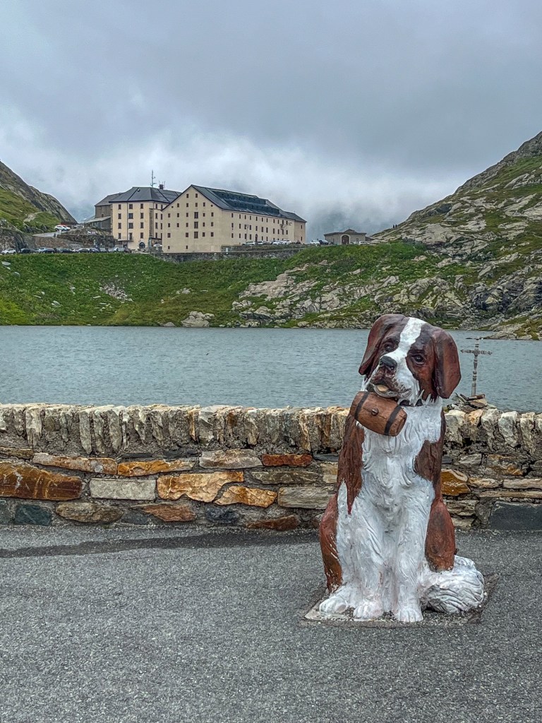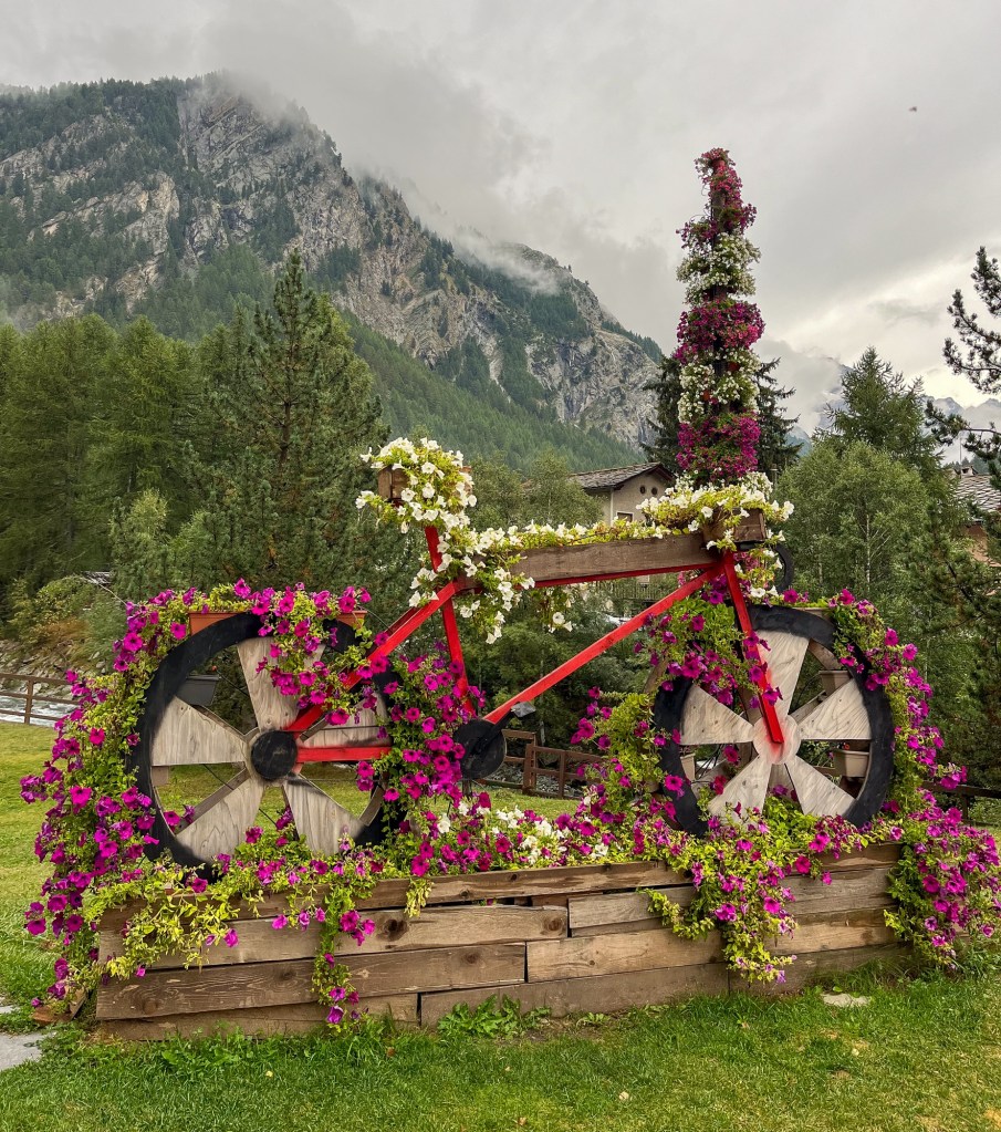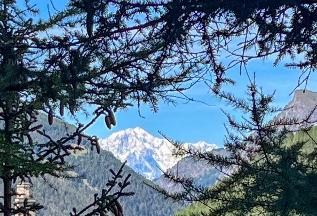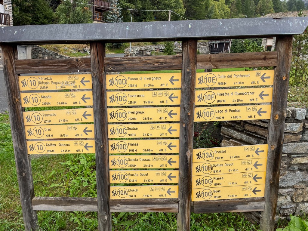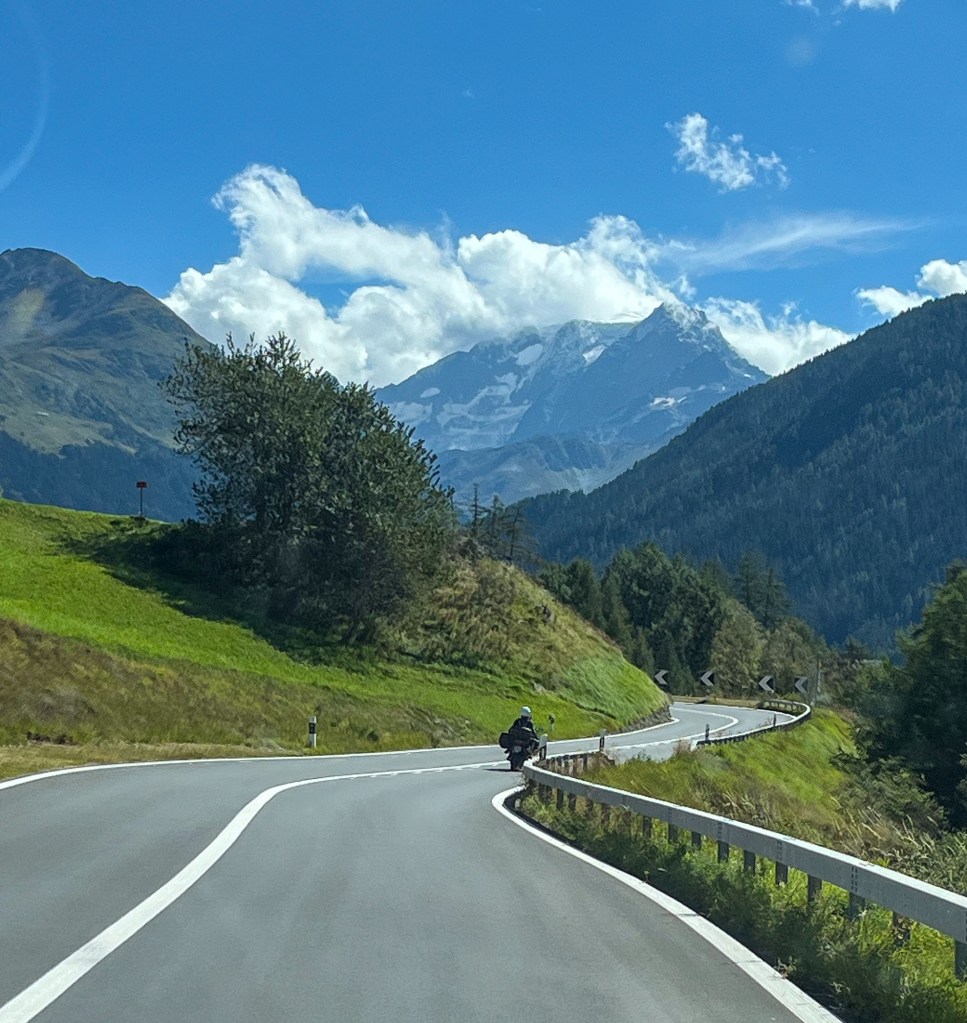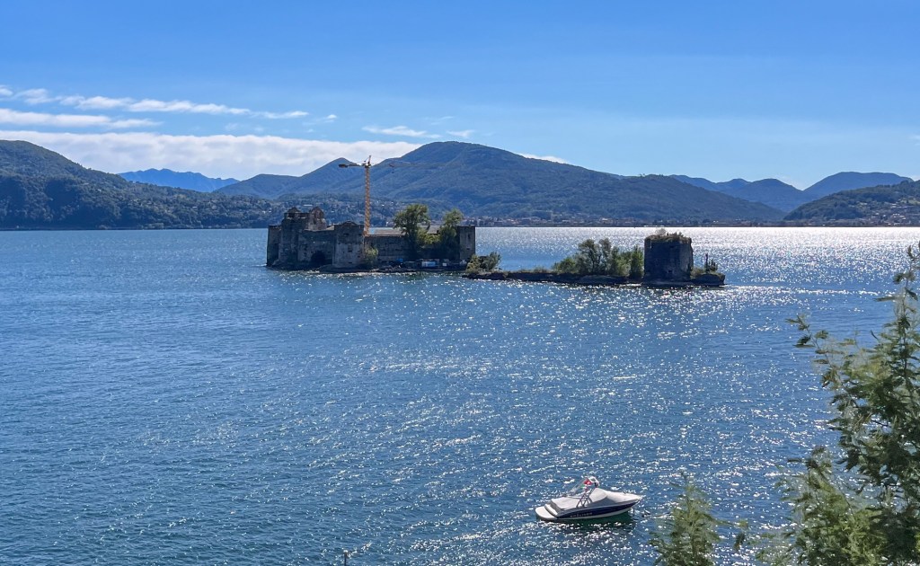 Litt pizza før «hjemturen».Og der har Mont Blanc fått vinterens kappe på seg.Utenom allfarvei. En camping og pizzeria ved veiens slutt.Idyllen kan brått ta slutt. Oppover var det så mye tåke at vi ikke så mye av omgivelsene. På vei ned Cogne-dalen møtte dette synet oss – halve veien vasket bort. Motgående trafikk var ledet opp fra elva via en svingete bakke på 15% stigning.Aosta dalen krongler seg gjennom fjellene fra Courmajeur ved den franske grensen til Torino. Hva med en borg på en høyde midt i dalen?Neste stop etter 220 kilometer, Lago d`Orta. En av innsjøene nord i Italia opp mot grensen til Sveits. De mest kjente er vel Lago Maggiore og Lago Como. Vi bodde på Camping Royal i Pratolungo. Fire netter og tre gåturer opp i åsene rundt sjøen. Trappene får man ta med ett smil.Gamle veier mellom landsbyene fungerer idag også.Det ser ut som gamleskogen har brent her. Lunsj på toppen med utsikt over sjøen og landsbyen.Det vokser og gror…Fruktbart område.Hus-dekorasjonPå veien mot Sveits kjørte vi et stykke langs Lago Maggiore. Det var en søndag, men trafikken gikk i 10 kilometer i timen. Da får man nyte et festningsverk på italiensk side. På vei til sveitsiske fjell gjennom St. Gothard passet. Vi tok den 17 kilometer lange tunnelen. Mens valgte zigzagene opp over fjellet, opp til snøen.